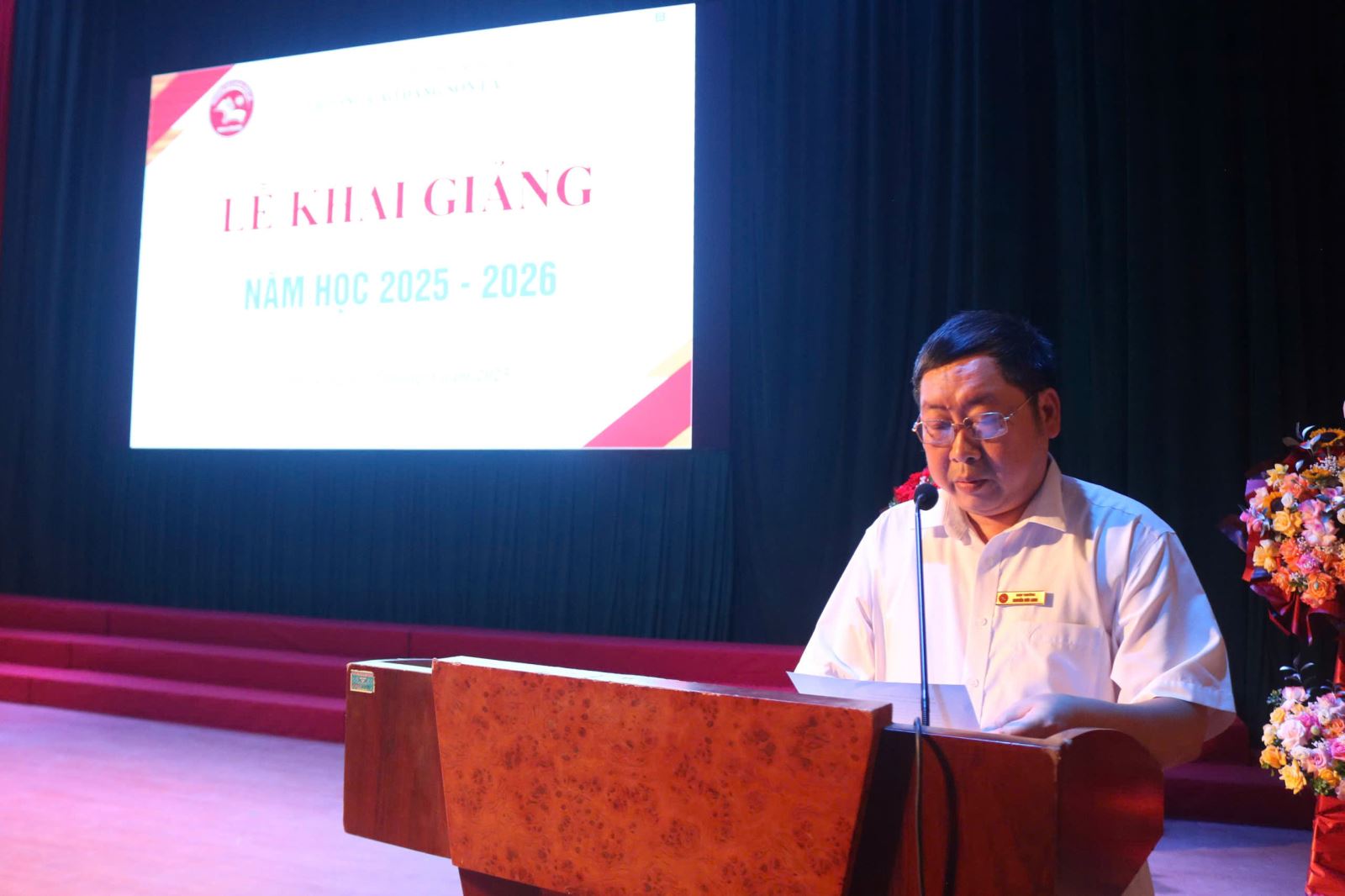Đồng chí Nguyễn Đức Long - Bí thư Đảng ủy, Hiệu trưởng nhà trường phát biểu