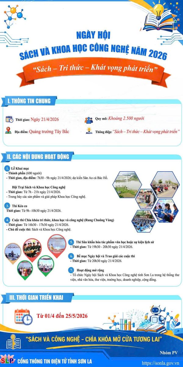 Nhằm hưởng ứng Ngày Sách và Văn hóa đọc Việt Nam (21/4) và thúc đẩy phong trào học tập, nghiên cứu khoa học trong cộng đồng, Ngày hội Sách và Khoa học Công nghệ tỉnh Sơn La năm 2026 sẽ chính thức được tổ chức vào ngày 21/4/2026 tại Quảng trường Tây Bắc.